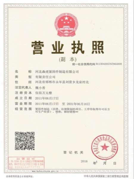 河北森虎緊固件制造有限公司成立于2011年,是建廠較早的緊固件企業(yè)。西臨京廣線,東臨京深高速,地理位置優(yōu)越,交通便利。 主要生產(chǎn):化學錨栓、機械錨栓、定型化學錨栓、高強度8.8級化學錨栓、自切底機械錨栓、車修壁虎,膨脹螺栓,植筋膠。 質(zhì)量方針:先進技術、科學管理、優(yōu)良品質(zhì)、用戶滿意; ...資質(zhì)榮譽